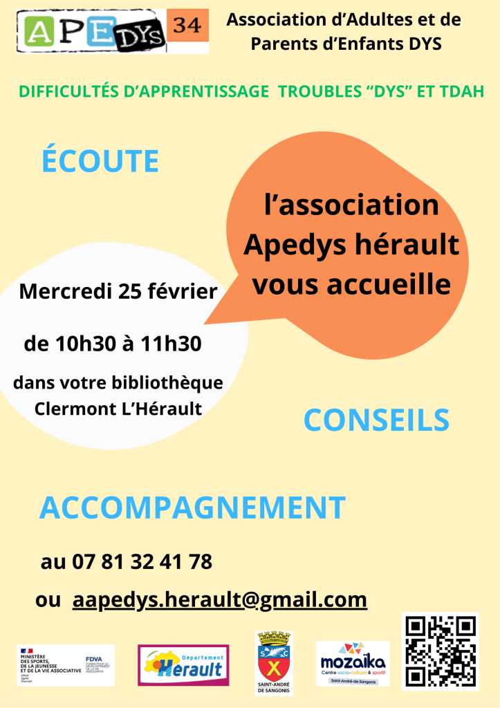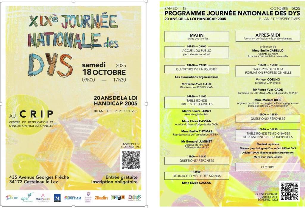 En 2025 la journée des dys organisée par les associations AEHPI, APEL, APEDYS 34, DMF 34, HyperSuper, Mauvais Cancres34,ALADIN a réuni une soixantaine de personnes (parents, équipe éducative, professionnels de santé…) autour de trois tables rondes.