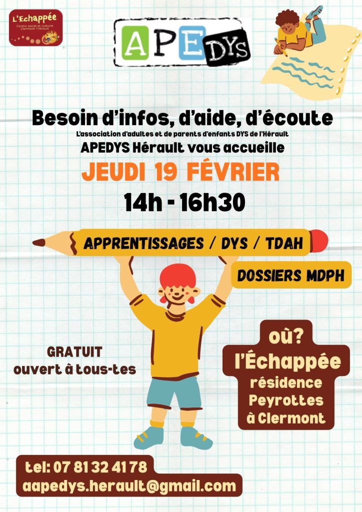 Élargir notre champ d’action sur le Clermontais et le Lodevois en proposant groupe de parole, café dys, atelier à thème….. Trouver des solutions pour les devoirs maisons du type « travail partagé ». Organiser des conférences avec des personnes expertes, par exemple lors du mois des DYS (octobre). Bien sur, continuer les actions déjà engagées sur la vallée de l’hérault.